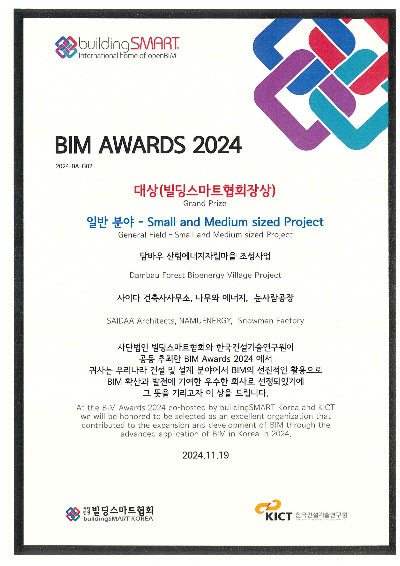 빌딩스마트협회 주관 BIM Awards 2024에서 눈사람공장이 Small and Medium sized Project 부문에서 [담바우마을 에너지자립마을 조성사업] 프로젝트로 대상을 수상하였습니다.